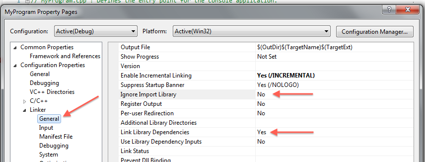 .libfile generated by the project won’t be used automatically by projects that depend on it. (Default: No) - Link Library Dependencies: This is the opposite of the other option. It’s specified on the project that uses other projects. If set to “No”, dependencies won’t be linked automatically. (Default: Yes)