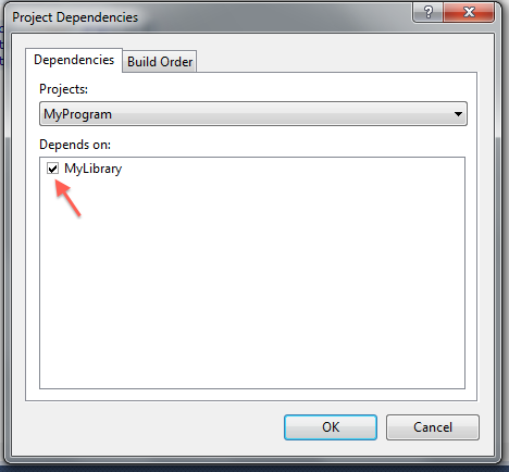 In Visual C++ 2008 or earlier, to define a project dependency several steps needed to be executed (in no particular order). These steps are described below. Note that these steps still work in Visual C++ 2010.
